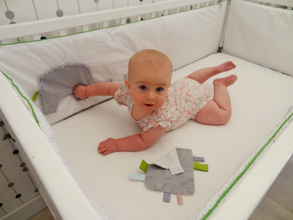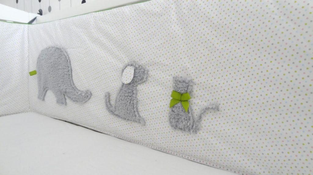 Kiedy zobaczyłam kropkowy ochraniacz do łóżeczka, stwierdziłam, że jest po prostu genialny. Nie dość, że jest mięciutki i śliczny (kropkowe zwierzaki odwalają kawał dobrej roboty!), to dodatkowo jest wyższy niż dostępne w innych firmach ochraniacze (ma 30 cm wysokości) i troczki do przywiązania ma zarówno na dole, jak i na górze. Moim zdaniem nie ma nic lepszego.