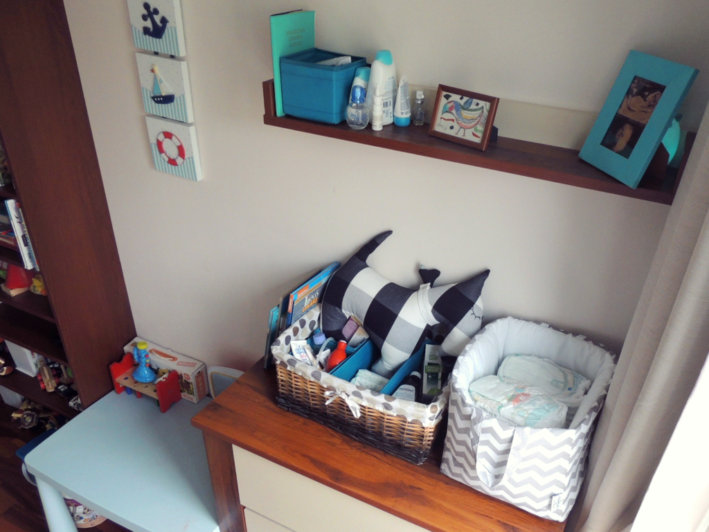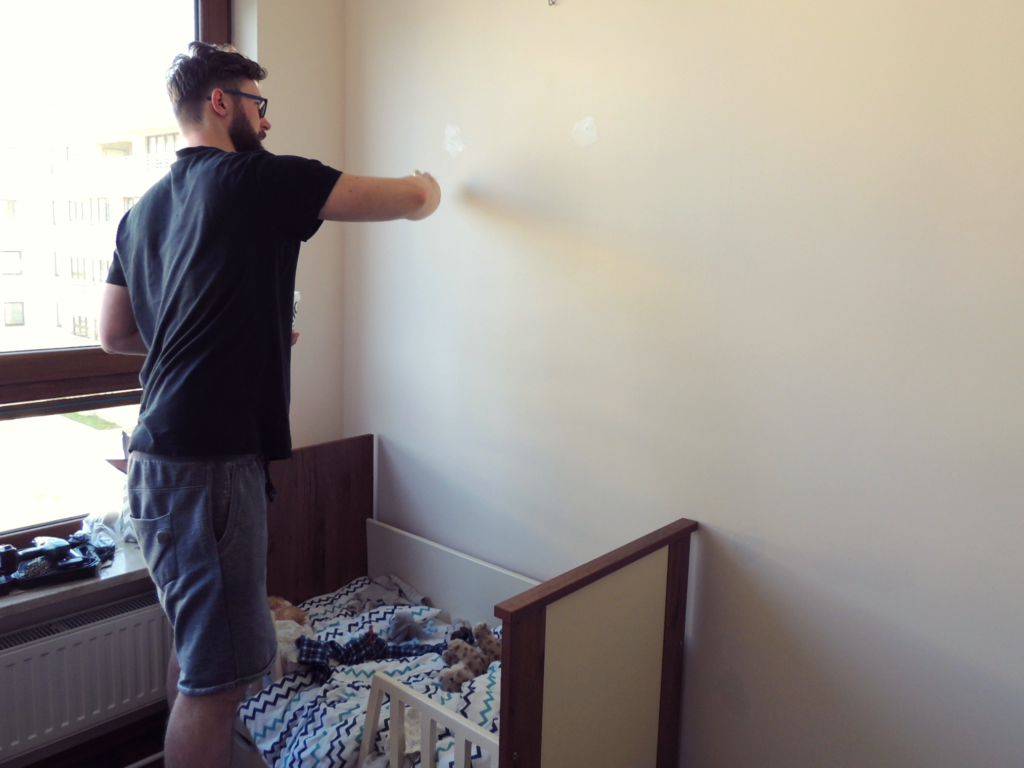 Ściany upstrzone były zwłaszcza na wysokości wspomnianego wyżej przewijaka (rodzice chłopców powinni doskonale zrozumieć dlaczego…), a że planowaliśmy też zdemontować tablicę sensoryczną , zarządziłam malowanie. Uprzedzając pytania: plamy były, mimo moich wysiłków, niezmywalne.