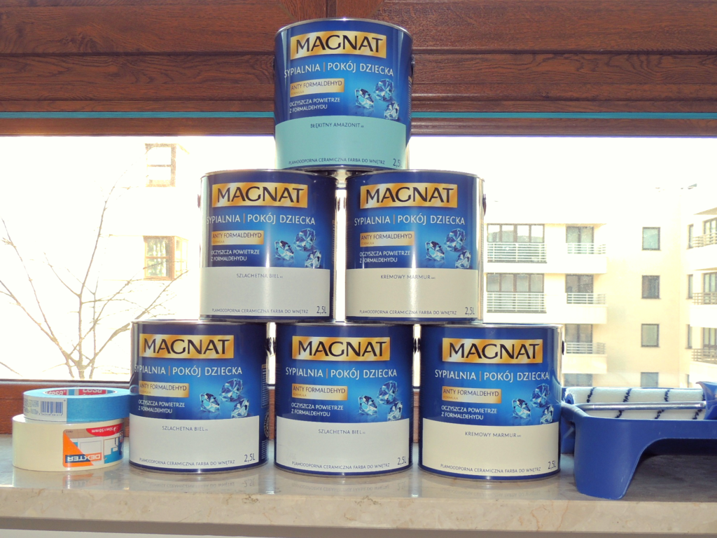 Po drugie chciałam wybrać farbę przeznaczoną do pokoju dziecięcego, bezpieczną dla dzieci ze skłonnościami do alergii , i wspomagającą jakość powietrza w środowisku, w którym dziecko przebywa najczęściej. Wybór padł na Magnat, ponieważ redukuje ona we wnętrzu poziom szkodliwego formaldehydu obecnego w meblach, dywanach czy panelach podłogowych.