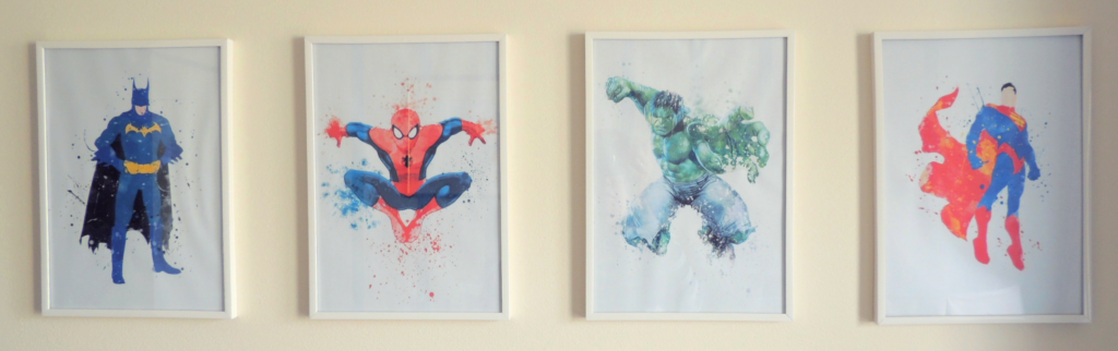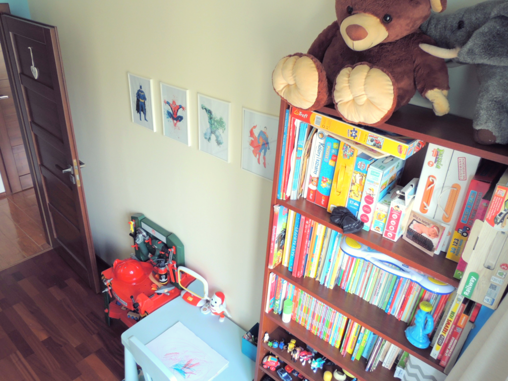 A poniżej efekty naszej pracy. Zniknęła niemowlęca komoda i półki , obniżyliśmy i przesunęliśmy pod okno regał, co dodało malutkiemu pokojowi bardzo dużo przestrzeni. Dywan został wymieniony na większy i bardziej miękki, zniknęły typowo niemowlęce obrazki, a w ich miejsce pojawiły się plakaty z superbohaterami .